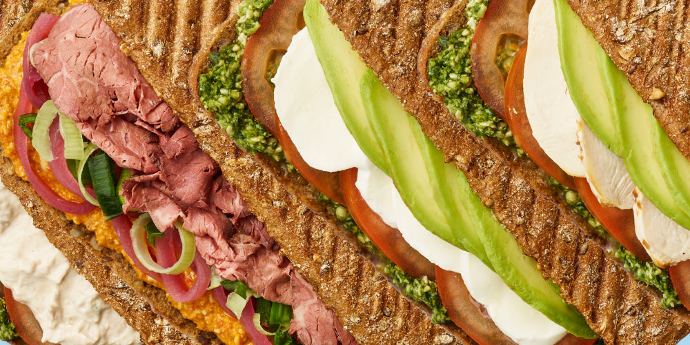 Hjemmelavede sandwiches på friskbagt brød – fyldt med sprøde grøntsager, protein fra kylling eller fisk eller plantebaserede alternativer samt cremede spreads.