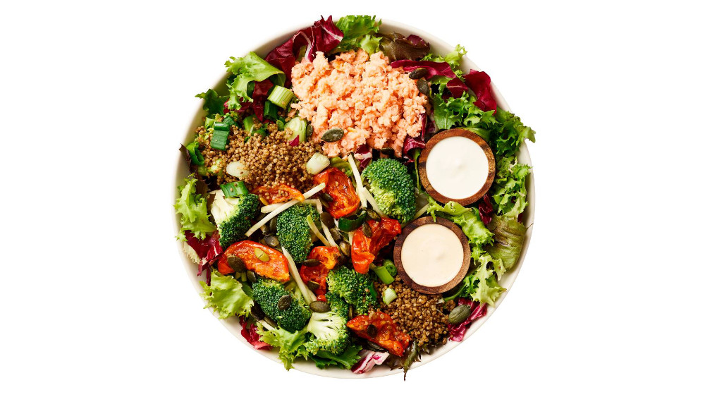 Quinoa & salatmix, varmrøget laks,broccoli, porre, semitørredetomater & ristede græskarkerner
